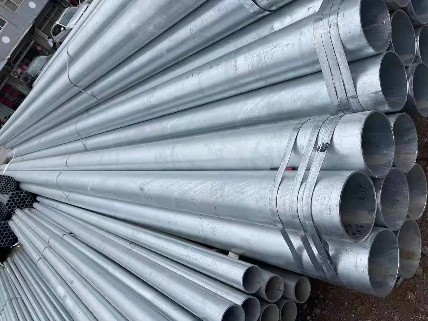 热镀锌管是使熔融金属与铁基体反应而产生合金层,从而使基体和镀层二者相结合。热镀锌钢管加工是先将钢管进行酸洗,为了去除钢管表面的氧化铁,酸洗后,通过氯化铵或氯化锌水溶液或氯化铵和氯化锌混合水溶液槽中进行清洗,然后送入热浸镀槽中。热镀锌具有镀层均匀,附着力强,使用寿命长等优点。热镀锌钢管基体与熔融的镀液发生复杂的物理、化学反应,形成耐腐蚀的结构紧密的锌一铁合金层。合金层与纯锌层、钢管基体融为一体,故其耐腐蚀能力强。